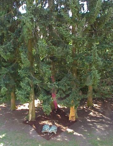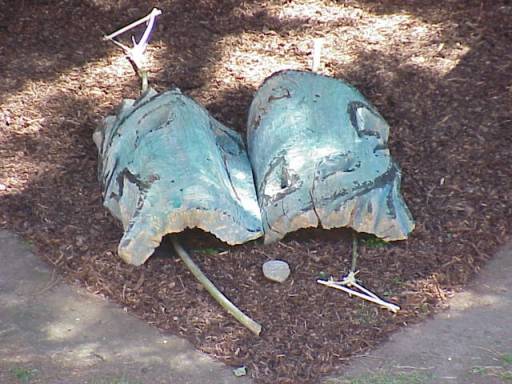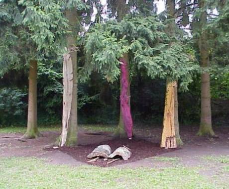 ![]() Installation "Element-Wächter" Gleichzeitig ordnete er den Elementen Farben und ihre alchimistischen Symbole zu, die er aus Weidenholz gefertigt hat.
