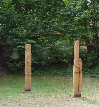 Skulpturen aus Eiche, Höhe jeweils 225 cm, Titel „Stele 1“ und „Stele 2“ entstanden im Jahr 2002.