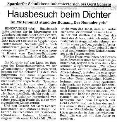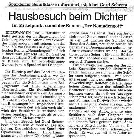 Die Klasse 9 A des Emil-von-Behring-Gymnasiums in Spardorf (bei Erlangen) nimmt den Roman als Lektüre im Deutschunterricht. Die 31 Schülerinnen und Schüler planen im Rahmen eines Projekts auch einen Besuch beim Autor in Colmberg-Binzwangen.